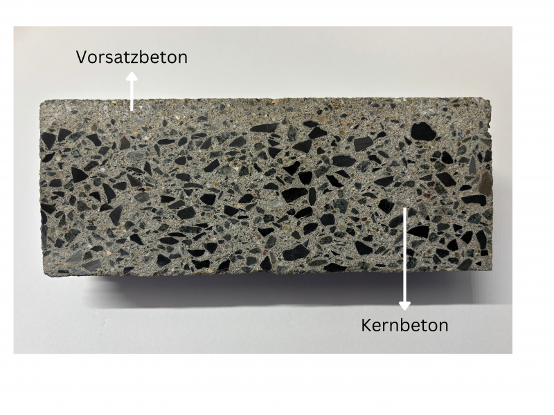 - Der Kernbeton bildet das Fundament des Betonpflastersteins. Diese Schicht besteht aus grobkörnigem Beton, der in erster Linie auf Druckfestigkeit und Stabilität ausgelegt ist. Der Kernbeton enthält meist grobe Gesteinskörnungen wie Kies oder Schotter sowie Zement und Wasser. Da er nicht sichtbar ist, werden hier optische Aspekte vernachlässigt. Ziel ist es, eine kosteneffiziente und belastbare Basis zu schaffen, die die mechanischen Anforderungen erfüllt.