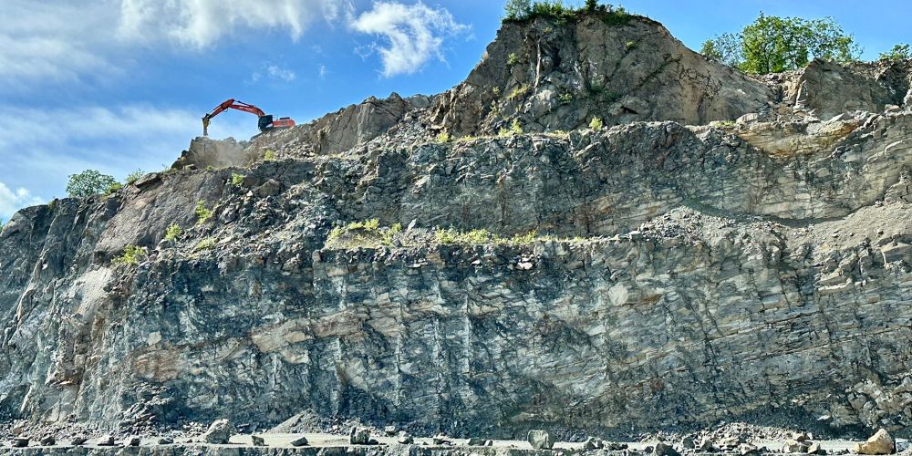 Zunächst wird der Oberboden mit Hilfe eines Hydraulikbaggers zentimetergenau abgetragen. Anschließend müssen die überdeckenden Nebengesteine entfernt werden. Diese bestehen aus unterschiedlich mächtigen Schichten schiefriger Sedimentgesteine, welche im Bohr-Sprengverfahren gelöst und anschließend abtransportiert werden.